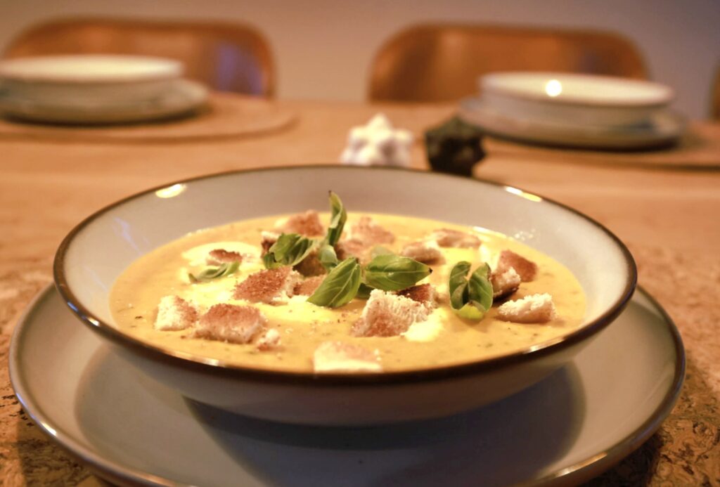 Häll i grädden, smaka av med salt och peppar. Kontrollera att grönsakerna är mjuka och vänd i basilika.